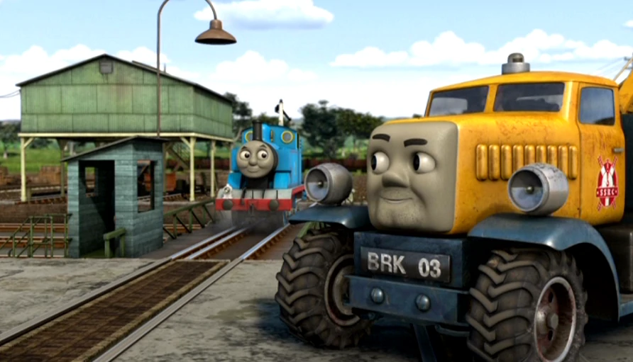 After what is honestly a pointless scene with Thomas and Butch racing past Gordon and James just to fill in the runtime, they finally arrive at the Search And Rescue Centre where Rocky gives them their first emergency call: taking metal poles to Farmer McColl so he can build a new sheep shelter as the old shelter was blown down. But when Butch remembers Victor's instructions about the red light on the magnet while trying to pick up the poles, Thomas tells him not to worry thus Butch ends up crashing his magnet so hard against the poles that he knocks them into the sea next to Captain...who like Rosie was also sadly restricted to only one speaking role per season in the Nitrogen Era. Before Thomas and Butch can go to the yard to get more poles, Rocky has another call: taking a new wheel to Rosie as her old wheel has cracked...and here we go again with the formula's second strike: Butch remembers Victor's orders, Thomas doesn't listen thus Butch causes Rosie's wheel to roll away and crash into Rocky. Okay, moving on!